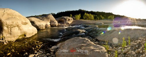 This has turned into pano week around here. Here is another panorama that I made in Texas of the Pedernales river. This one isn’t quite so wide. I was constrained by the position I chose across from the mini falls here. The big rock on the left and the sun on the right.
